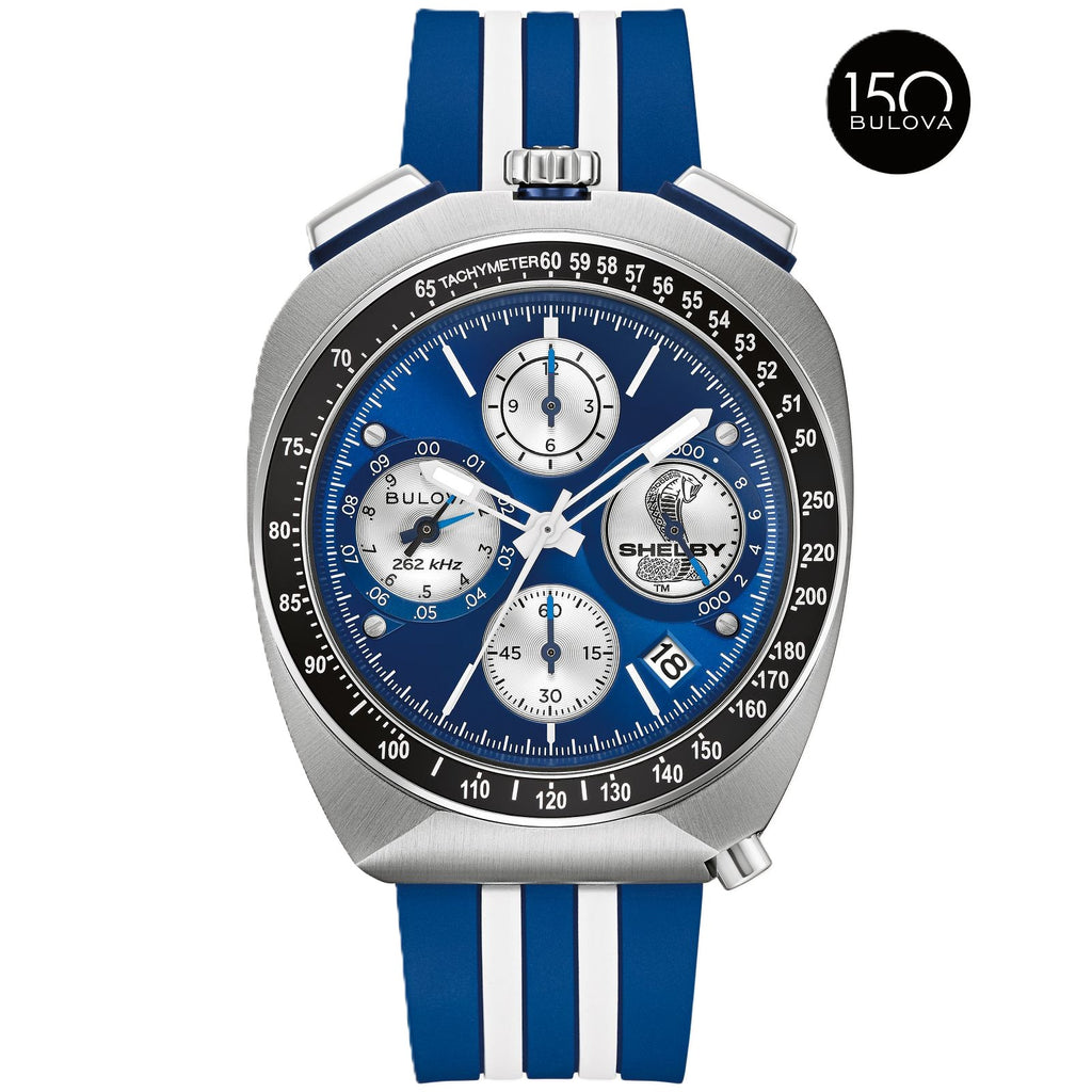 Experience the thrill of speed, right on your wrist. As part of a new collaboration for Bulova’s 150th Anniversary, the new limited-edition Bulova Racing Chronograph combines legendary muscle car customizer Carroll Shelby’s trailblazing racing style with Bulova’s innovative watchmaking technology. Shelby’s signature blue and white colorway is on full display, striping the rubber strap, accenting the dial, and elevating the 43 mm silver-tone stainless steel case. Inspired by the massive power of the 1967 Shelby Ford Mustang GT500, the angular bullhead case offers a dramatic presence on the wrist, recalling the aerodynamic lines of that iconic car and including a black tachymeter ring, sapphire crystal, 12 o’clock crown and pushers, and a grooved mid-case echoing the car’s racing stripes. With the Shelby Cobra logo nestled in the 3 o’clock register, the dial roars to life with 8-hand chronograph functionality, including timing to an astonishing 1/1000 second, powered by Bulova’s proprietary high-precision quartz Precisionist movement, resonating at a frequency of 262 kHz for unparalleled accuracy and allowing a sweeping chronograph hand. With an individually numbered polished case back bearing Shelby’s signature and delivered in a limited-edition box with a 1:24 die-cast model of the GT500, the new Racing Chronograph brings the power of Shelby’s creations to your wrist for unparalleled style. Limited to 7,500 pieces worldwide.