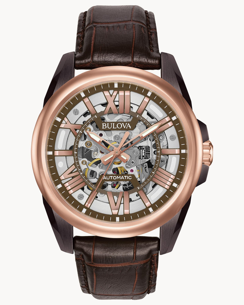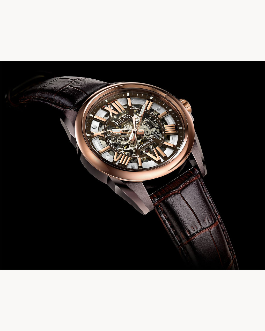 Carátula esqueletada que permite ver le movimiento del reloj en funcionamiento con indicadores en números romanos y manecillas en oro rosa.
