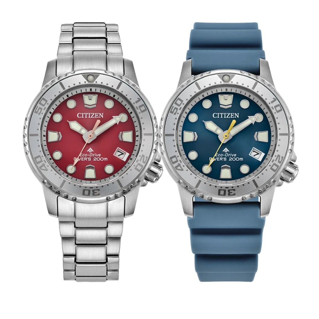 Citizen 星辰 Promaster Dive EO2027-50Z Red 紅色 EO2027-09L Dive Blue Dial Polyurethane Strap, 藍色錶盤合成橡膠錶帶, Eco-Drive Stainless Steel Lady Watch 光動能不銹鋼女士手錶